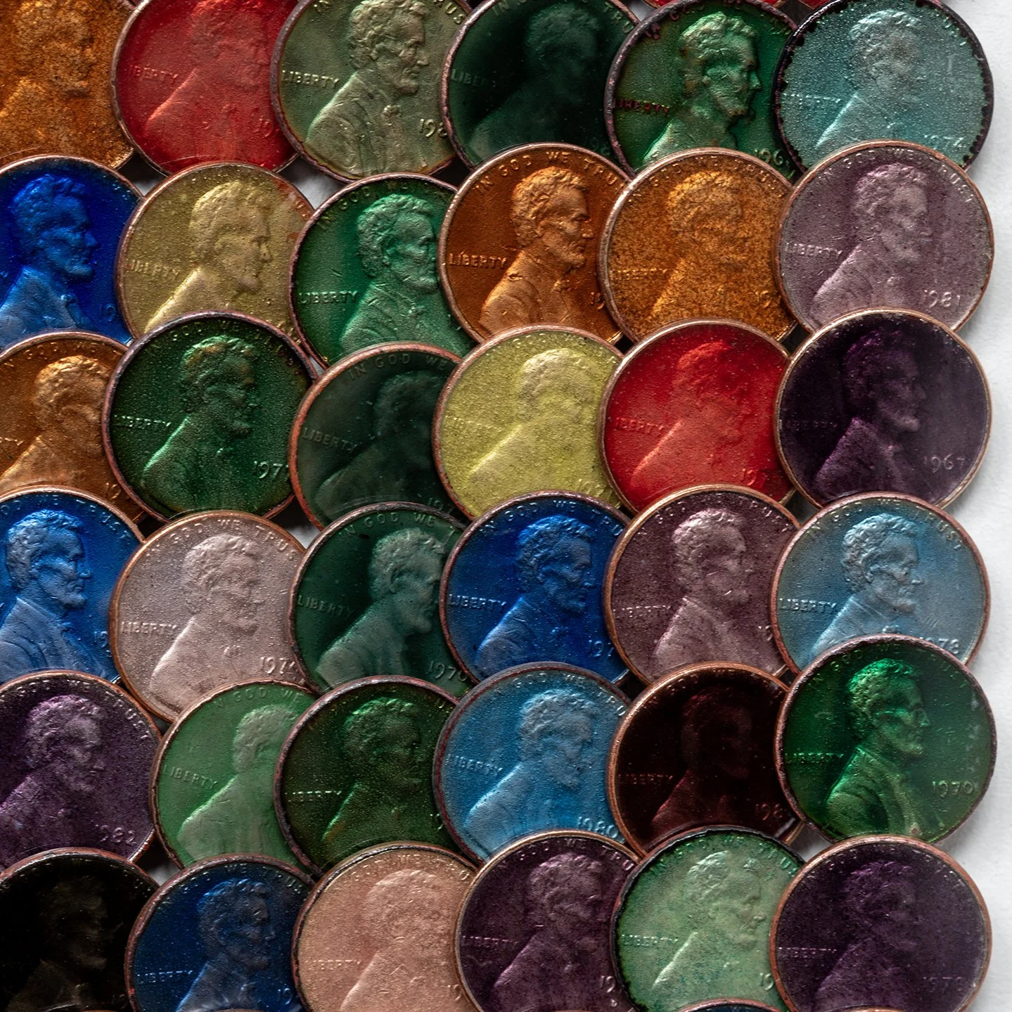 Solid copper pennies have been transformed through the historic technique of vitreous enamel. Vitreous enamel is a material made by fusing powdered glass to a substrate by firing in a kiln. The powder melts, flows, and then hardens to a smooth, durable vitreous coating. The word comes from the Latin vitreum, meaning "glass".
